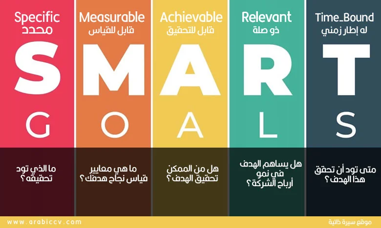 - مرتبط بالزمن (Time-bound): تحديد إطار زمني لتحقيق الهدف، مما يخلق نوعًا من الضغط الإيجابي على العمل ويحفز الإنجاز.