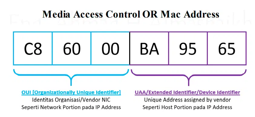 - التكوين: يتضمن عادةً قسمين رئيسيين؛ قسم المصنع أو الشركة المصنعة، وقسم خاص بالجهاز ذاته، حيث يُعرف القسم الأول بعنصر الشركة المصنعة (Organizationally Unique Identifier – OUI).