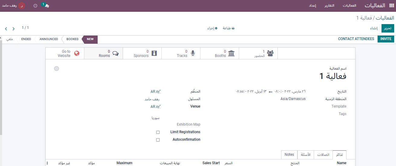 وظائف ووحدات نظام أودو المتخصصة في إدارة الفعاليات